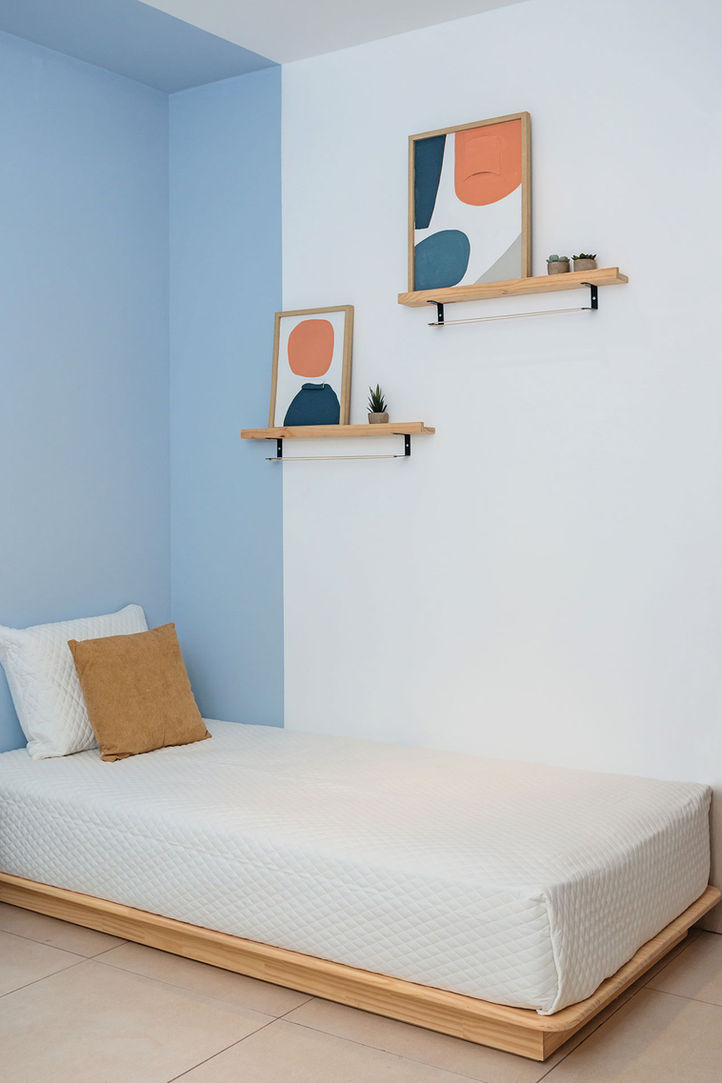 Custom made pieces: Morro lightings, Wrap bench (living room), 1/3 dining table, Roll chair, Fabi Flo Art (dining room), stackable twin beds.