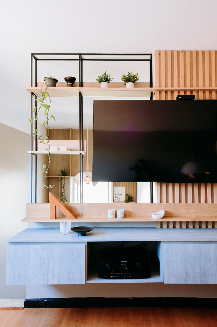 A comfortable and stylish family room that adapts to the rest of the house in every detail: from the five-section sofa for receiving guests and sleeping over to the peculiar design of the bookcase that is visible from the second level and blends perfectly with the tv cabinet.